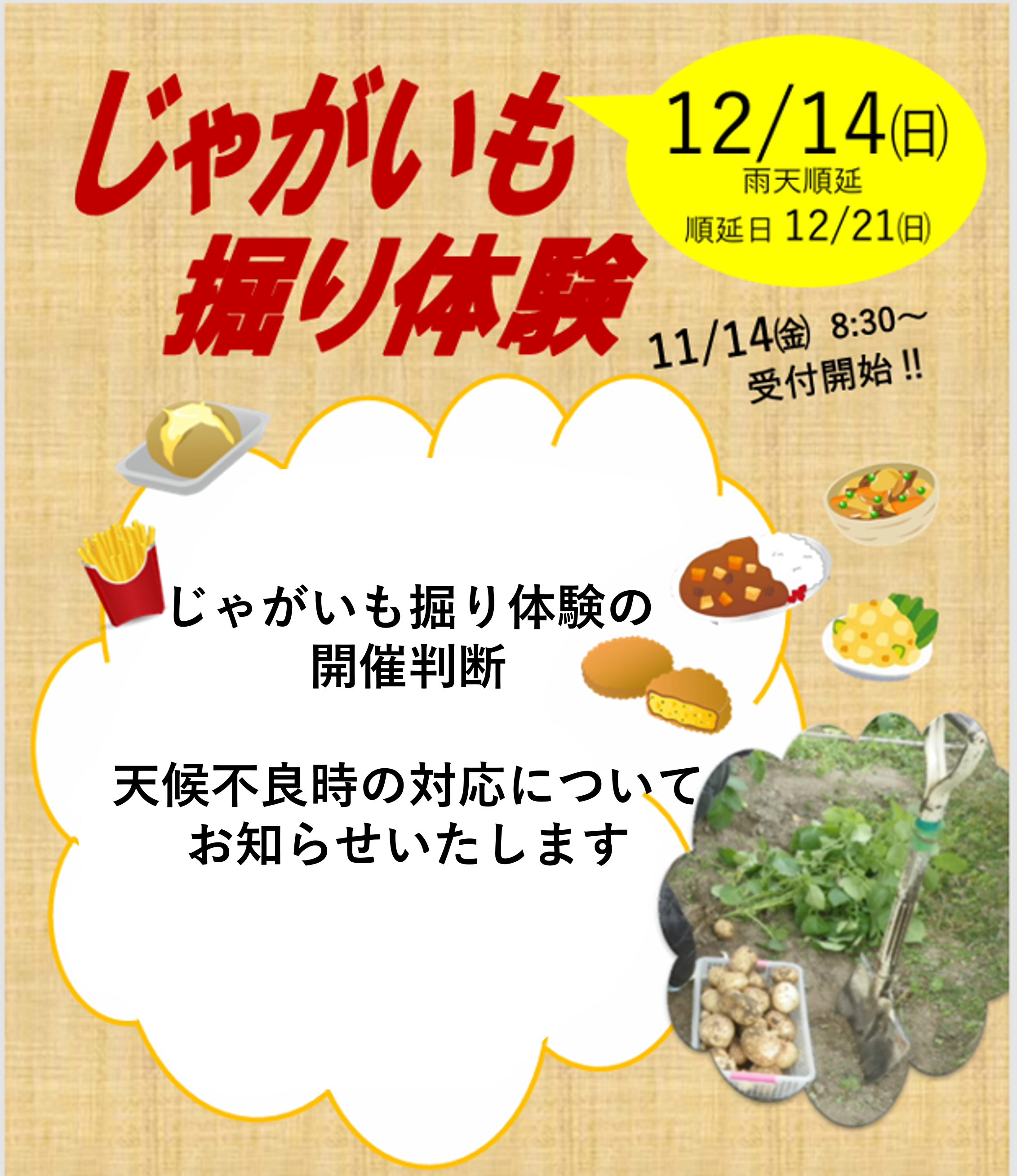 じゃがいも掘り体験の開催判断、天候不良時の対応についてお知らせいたします。